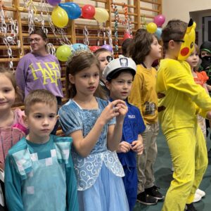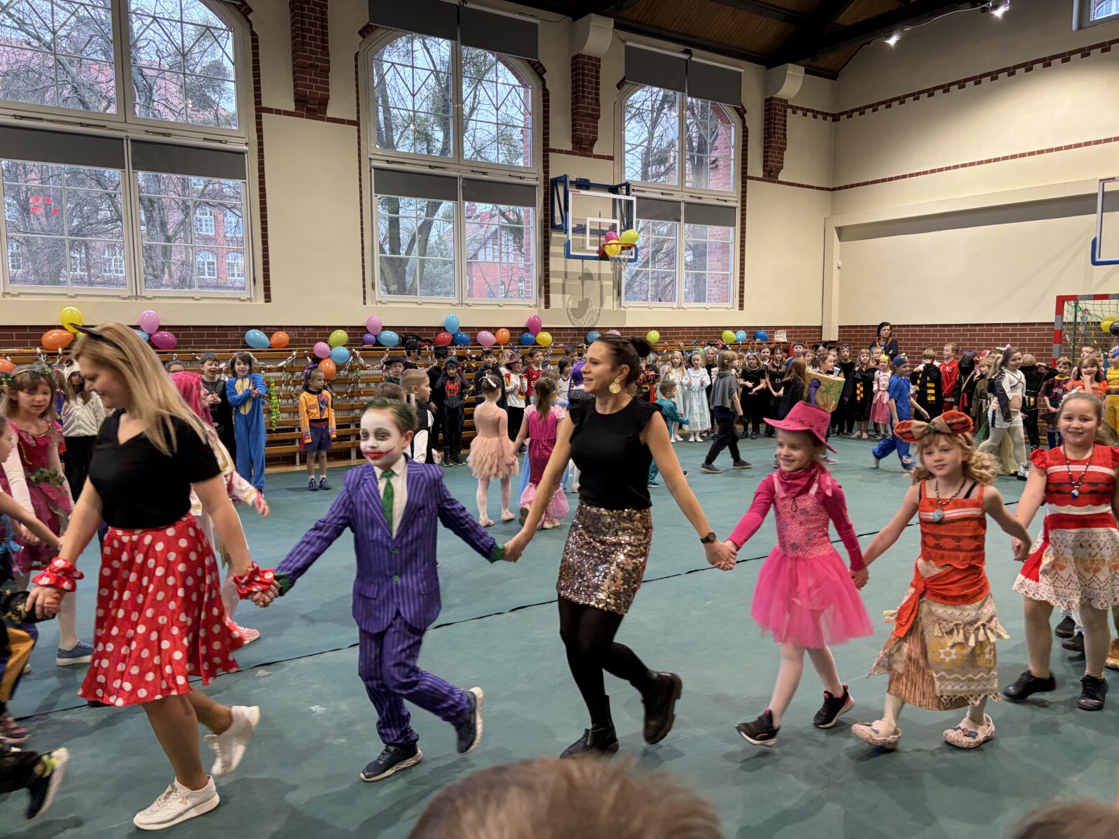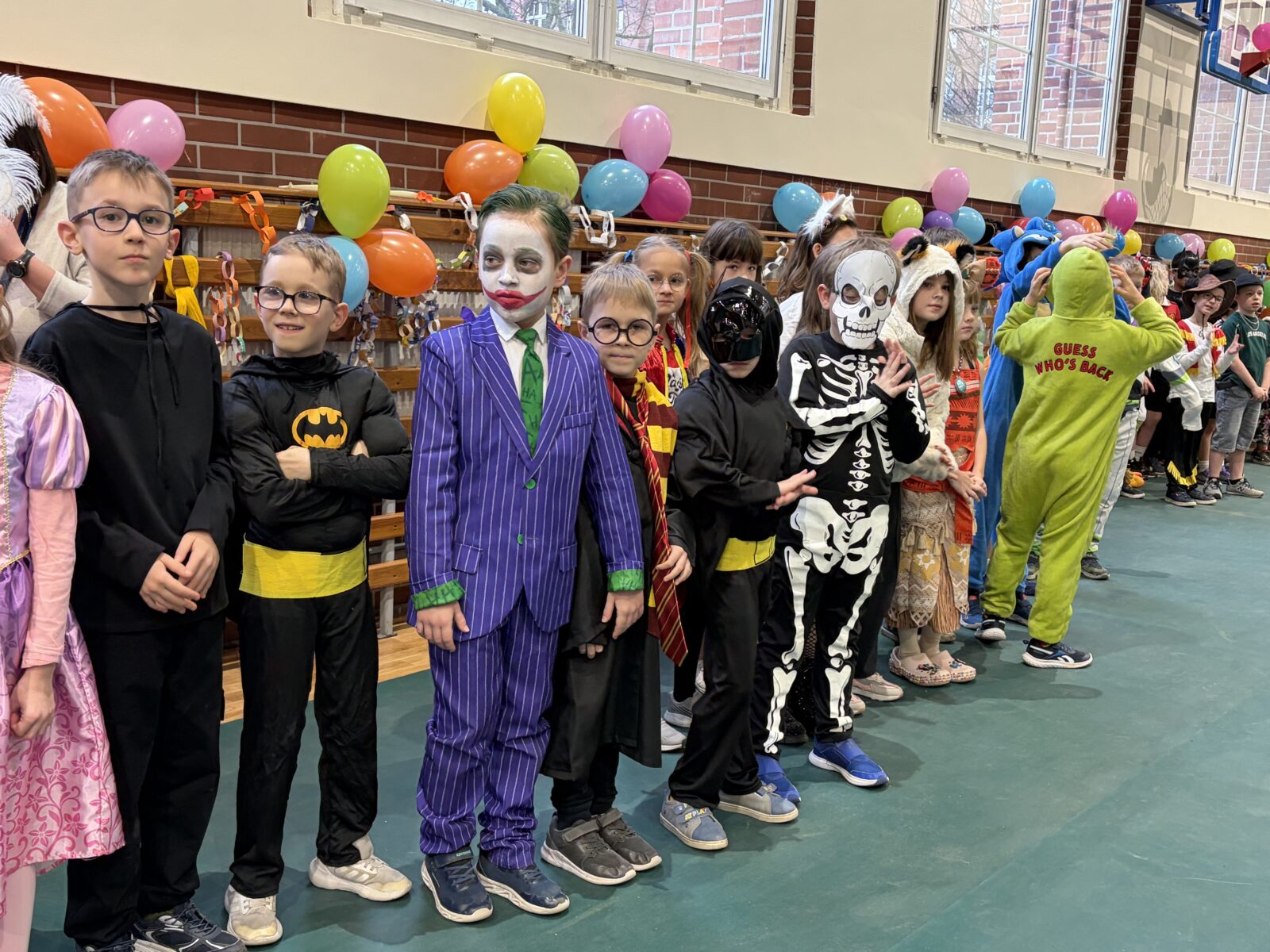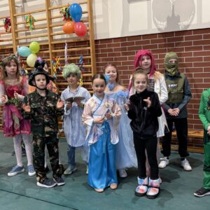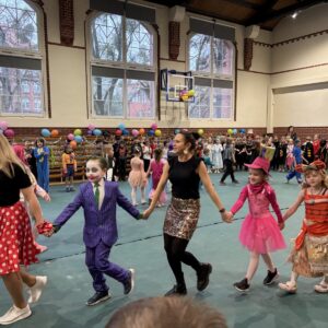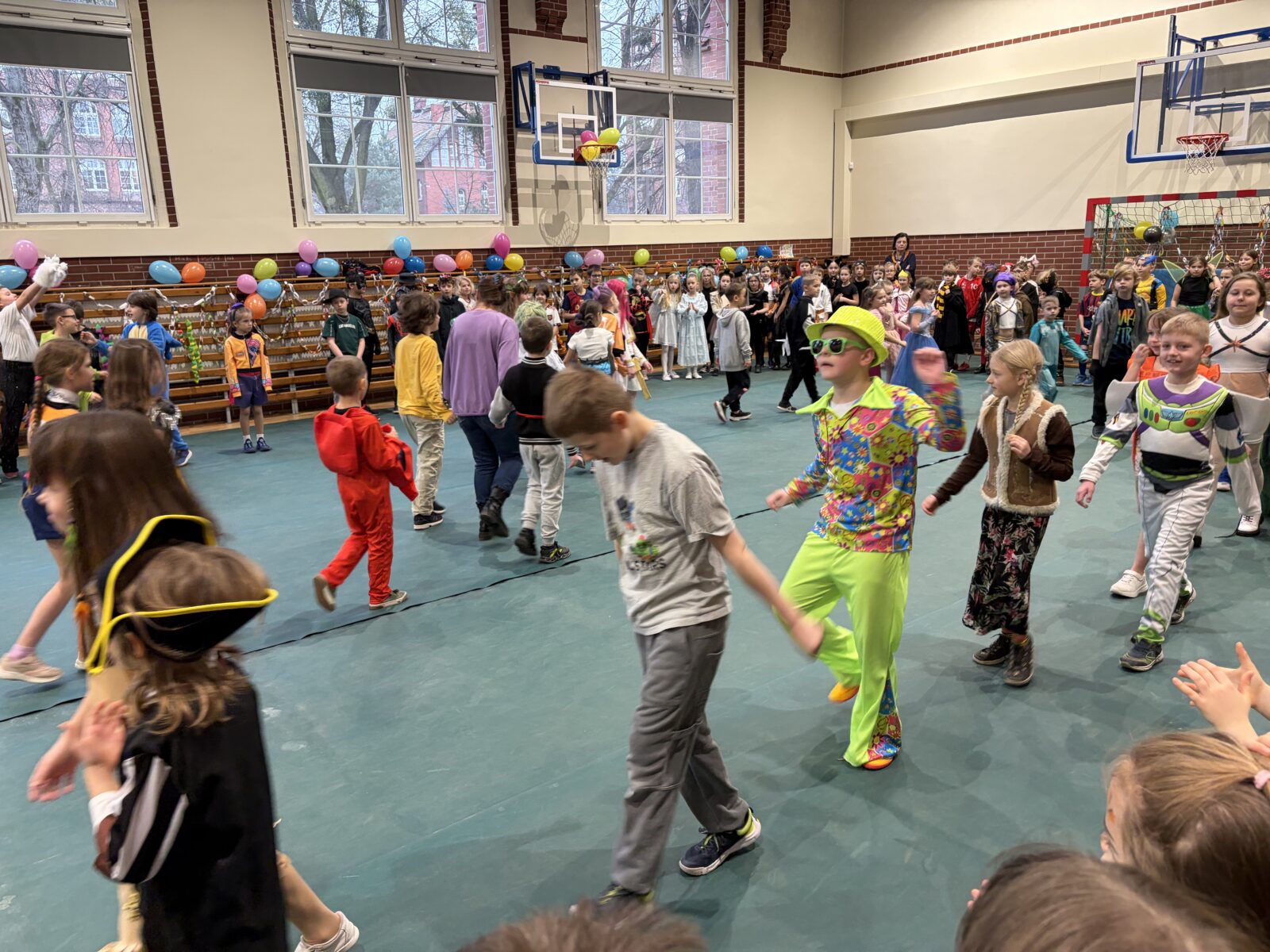… sto, a może i więcej! Nasza sala gimnastyczna zmieniła się w salę balową. Widok tylu tak wspaniale poprzebieranych dzieci aż zapierał dech! Różnokolorowi, weseli przebierańcy świetnie bawili się w piątek 30 stycznia, tańczyli i skakali w rytm muzyki, tworzyli barwne korowody i kółeczka, na wyścigi startowali w przeróżnych  zabawnych konkurencjach. Było głośno, wesoło, tanecznie… jednym słowem KARNAWAŁOWO!