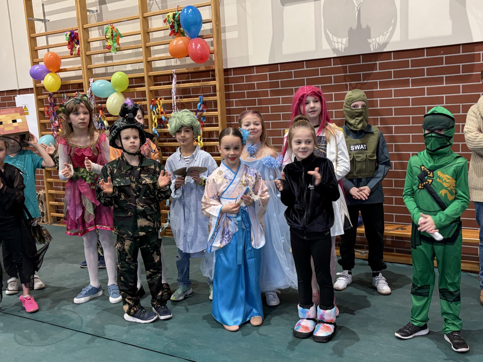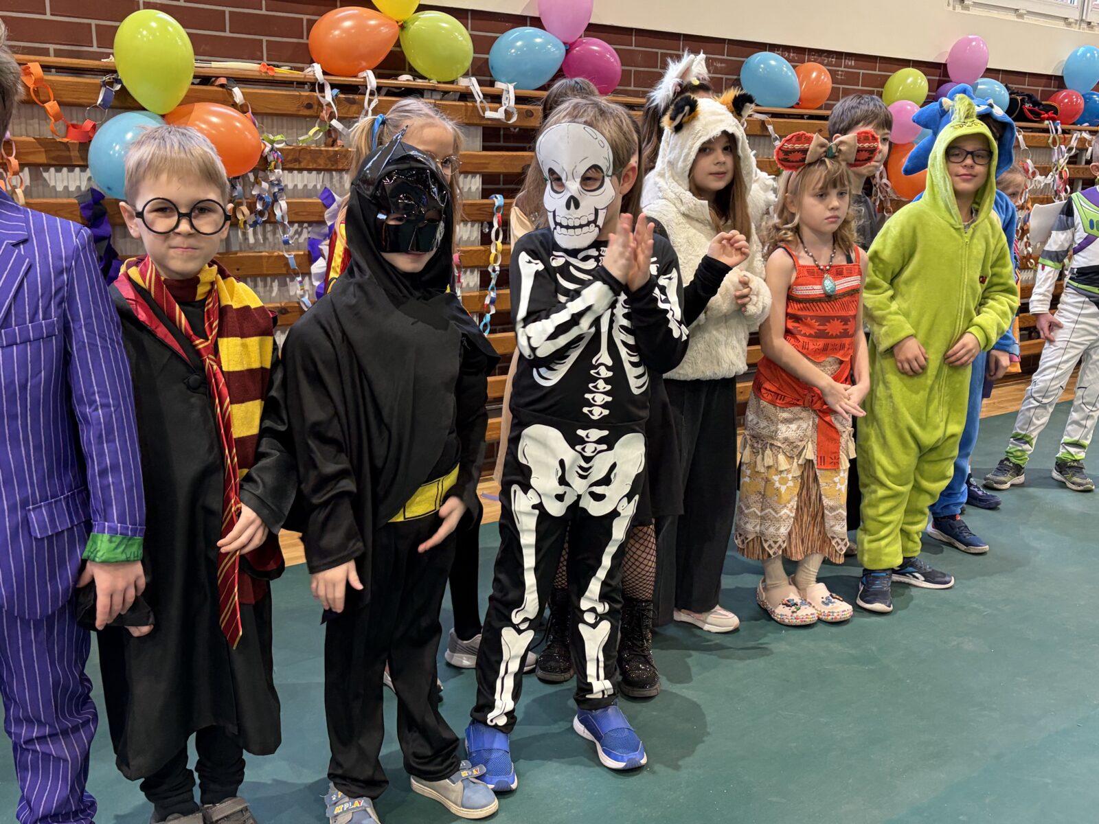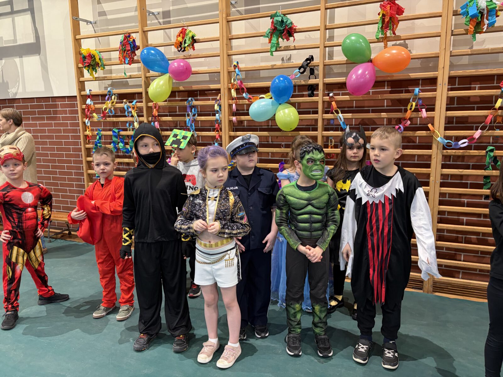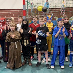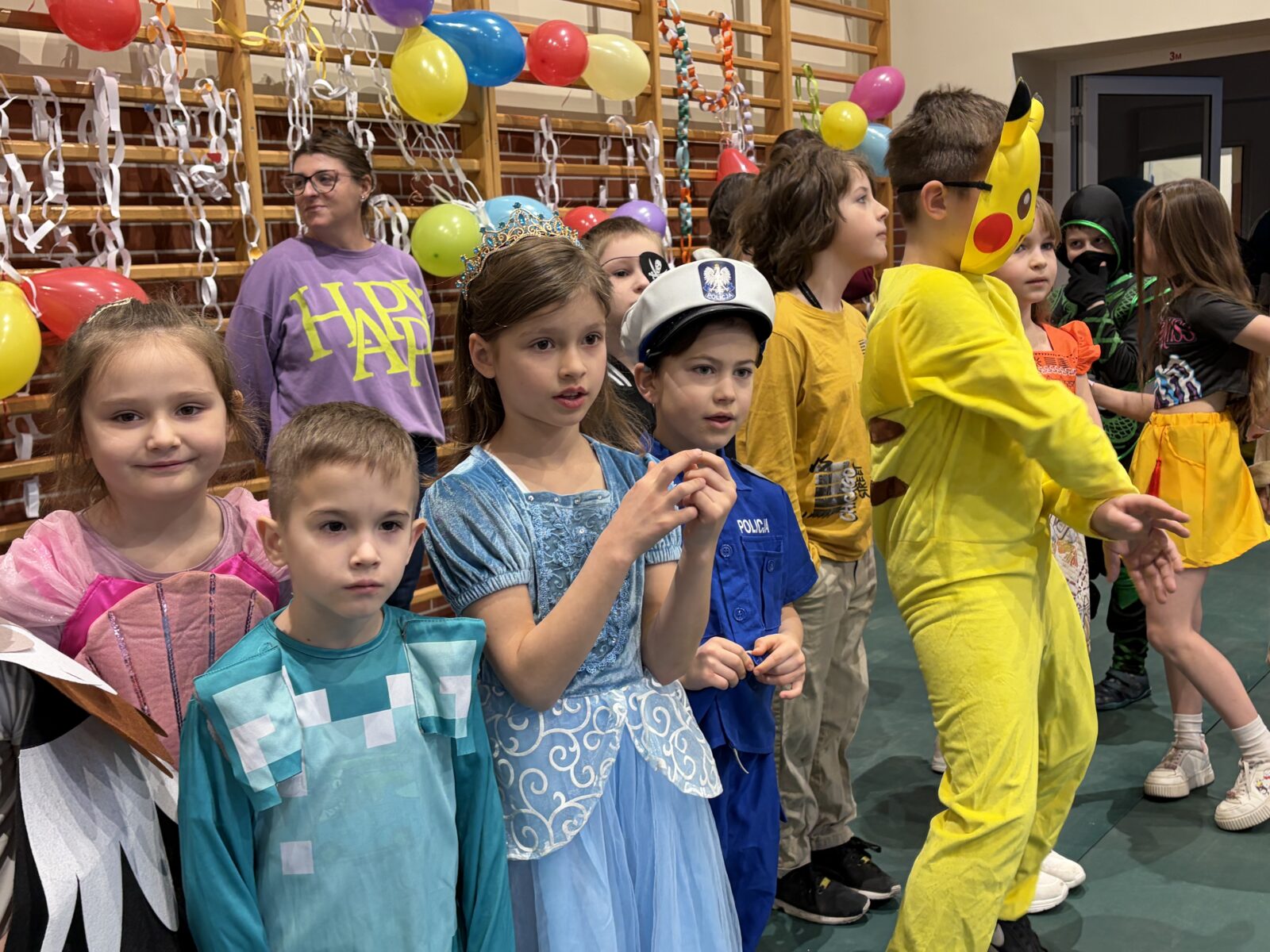 … sto, a może i więcej! Nasza sala gimnastyczna zmieniła się w salę balową. Widok tylu tak wspaniale poprzebieranych dzieci aż zapierał dech! Różnokolorowi, weseli przebierańcy świetnie bawili się w piątek 30 stycznia, tańczyli i skakali w rytm muzyki, tworzyli barwne korowody i kółeczka, na wyścigi startowali w przeróżnych  zabawnych konkurencjach. Było głośno, wesoło, tanecznie… jednym słowem KARNAWAŁOWO!