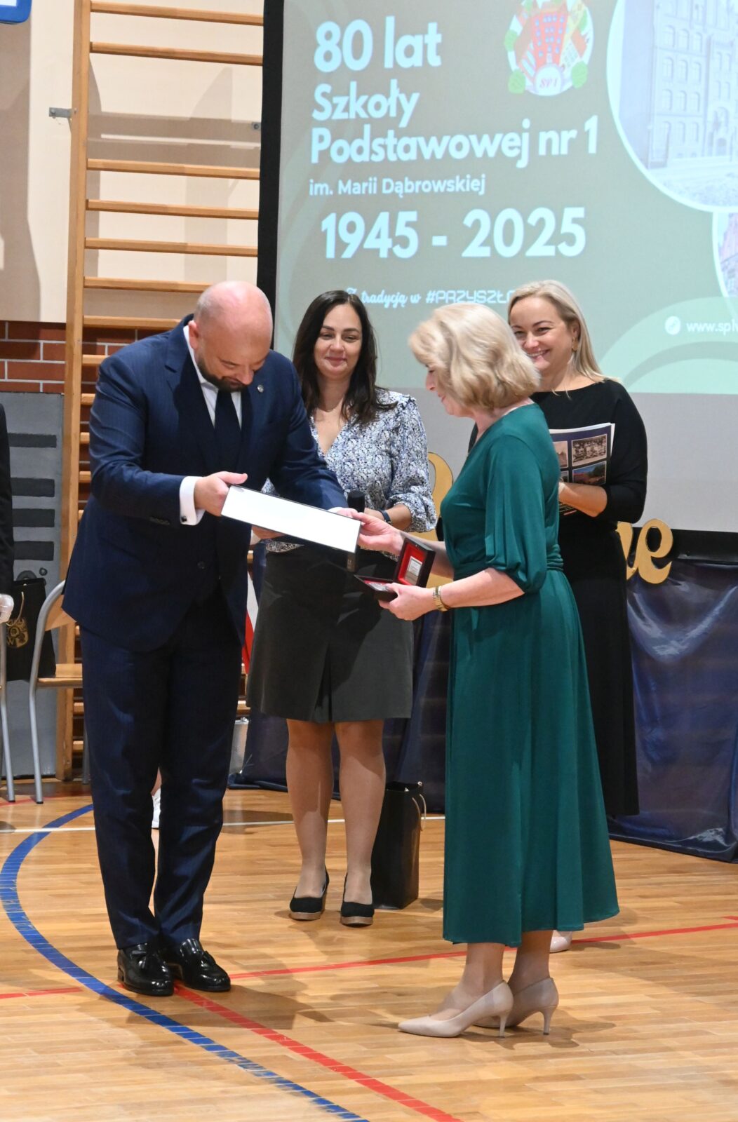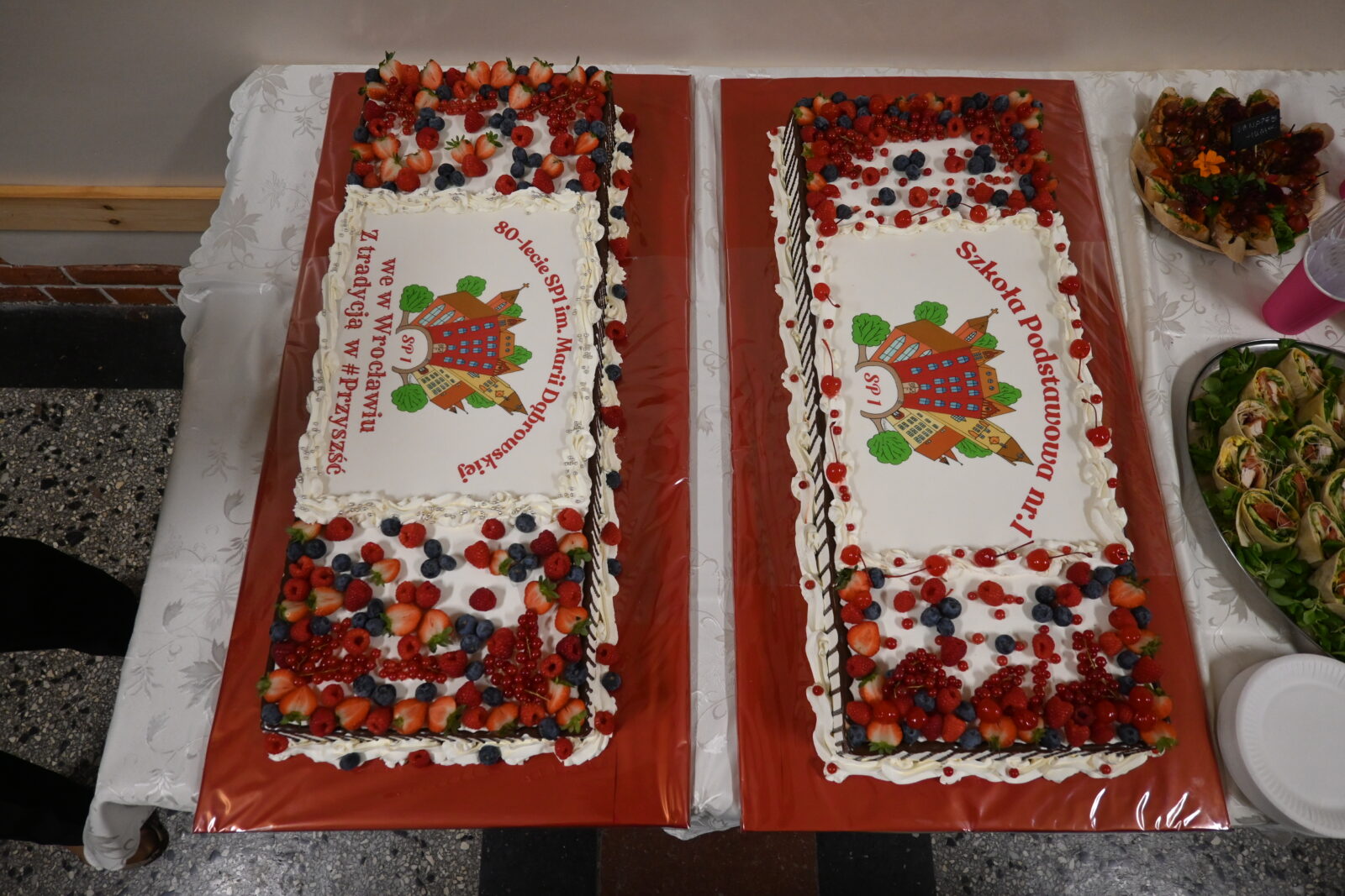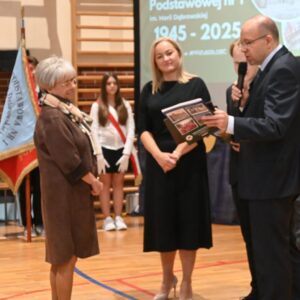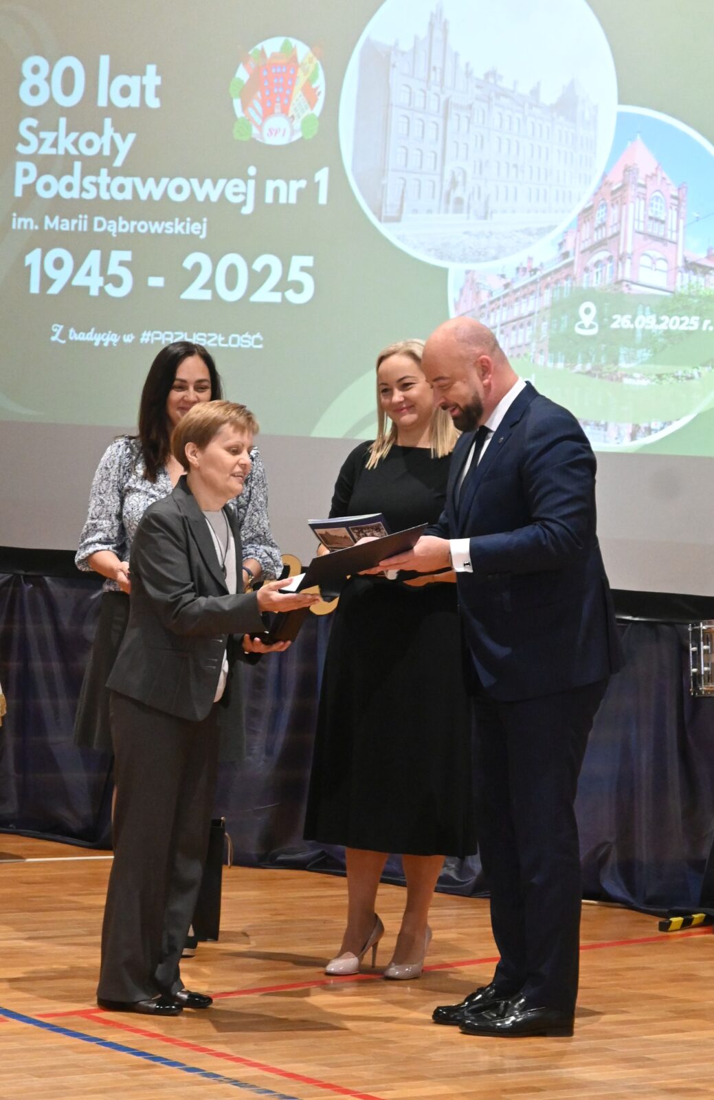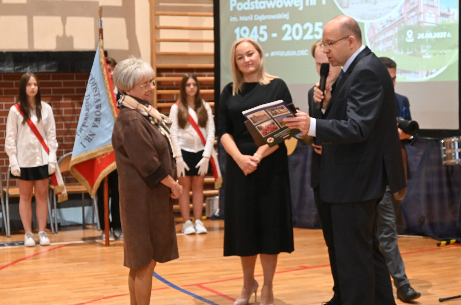 W piątek 26 września 2025 roku w naszej szkole obchodziliśmy wyjątkowe święto – jubileusz 80-lecia istnienia pierwszej utworzonej w powojennym Wrocławiu podstawówki – naszej Jedynki. Wiele tygodni przygotowań, prób, pracy uczniów, nauczycieli, pracowników sprawiło, że dzień ten zapamiętamy na długo. Podniosłość (ale bez zadęcia!), wzruszenia (czasami z łzami), wspomnienia (dużo wspomnień), uśmiechy  (zadowolenie, radość) – to wszystko było i wiele jeszcze więcej… W części oficjalnej przemawiała Pani Dyrektor Katarzyna Zwierzyńska-Paluszek, przemawiał, składał życzenia i wręczał medale Prezydent Wrocławia Jacek Sutryk, był też czas dla Pani Dyrektor Renaty Bohdanowicz (20 lat na stanowisku 1996-2016). Potem śliczne przedstawienie w wykonaniu dzieci o tym, jak uczyliśmy się kiedyś, jak uczymy się dziś i co w szkole najważniejsze. Następnie odsłoniliśmy tablicę pamiątkową przy sali chemiczno-fizycznej, której nadaliśmy imiona Antoniego Goncerzewicza i Barbary Platis (odbyła się też nowoczesna lekcja  chemii). Na parterze goście zwiedzali sale tradycji, oglądali tablice z naszymi znanymi absolwentami, robili sobie zdjęcia w szkolnej fotobudce, składali (pisali) życzenia dla szanownej Jubilatki (naszej Szkoły). W kawiarenkach słychać było gwar wspominających dawne czasy absolwentów, nauczycieli, pracowników… Pojawił się też wielki tort, jak na urodziny przystało! Dziękujemy wszystkim Gościom za bycie z nami w tym ważnym dla nas dniu, dziękujemy za życzenia, dobre słowa  i prezenty. Dziękujemy wszystkim, którzy przyczynili się do tego, że było po prostu PIĘKNIE!