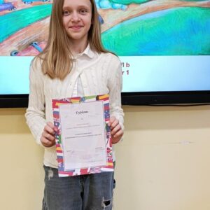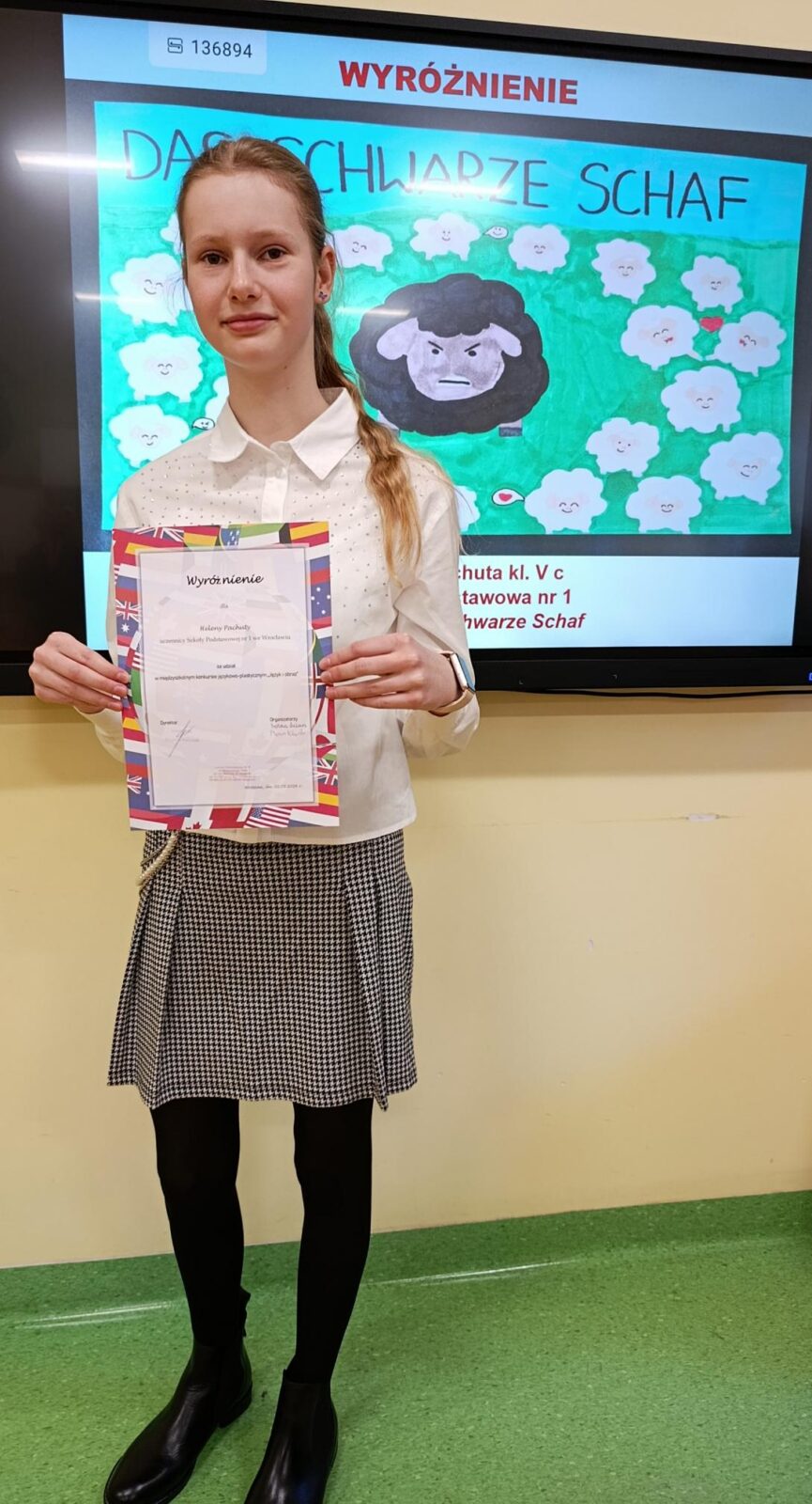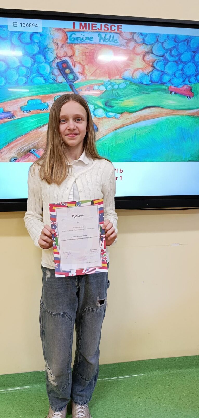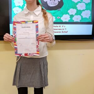 Kilka uczennic z klas 4–8 wzięło udział w międzyszkolnym konkursie języka niemieckiego pt. „Język i obraz”, organizowanym przez Szkołę Podstawową nr 9 we Wrocławiu. Zuzanna Kałużna z klasy 6b zdobyła I miejsce w kategorii klas 4–6 za pracę z idiomem „Grüne Welle”, natomiast Helena Pachuta z klasy 5c otrzymała wyróżnienie w tej samej kategorii za zobrazowanie idiomu „Das schwarze Schaf”.
